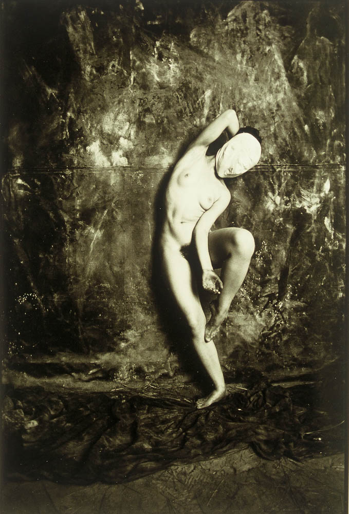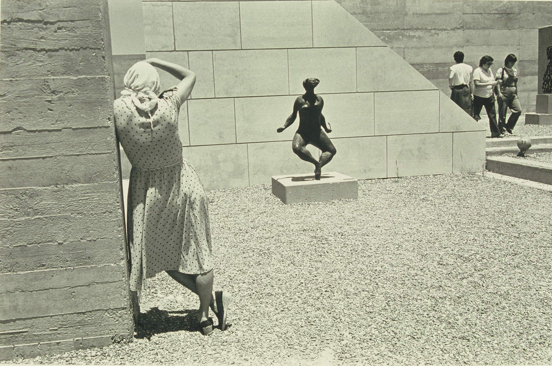 — She, masked, at first glance a balanced arc, ultimately reveals not a harmonic, gentle stance; the stressed contraposition of body, limbs, and feet is betrayed by that supplicative hand: the rigorous achievement of her pose now outside of time, permanent. - She, her head enshrouded, leans, shoulder against a wall; the arm above, the revealed musculature of her back and hips, a rigid leg and profiled vertical foot suggest a stabilizing posture for camerawork; afar, at upper right, ambulation stopped; between, a bronze, fabricated to configure a stilled instant of elan vital: the photograph itself and its internal definitions declaring the fix of time and motion. — She faces the wind, her arms outstretched, hands holding the hem of her skirt to net the air; she, leaning back, her profile like the contours of mountains and clouds, her dark pendant hair like strands of vegetation; she, desert flowers, mounds and mountains, clouds and flesh, wind and light, are now concretized in silver.